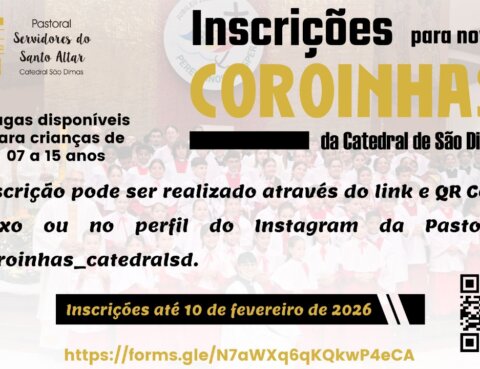 Estão com inscrições abertas para formação de novos Coroinhas. PARA CRIANÇAS DE 7 A 12 ANOS A inscrição pode ser feita através do link ou QR Code no cartaz afixado…