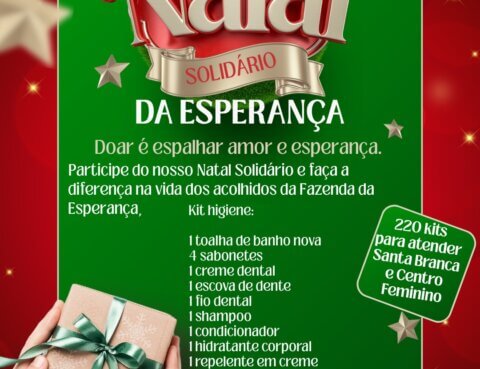 Arrecadação de KITS DE HIGIENE e cuidados pessoais para as FAZENDAS DE SANTA BRANCA (centro masculino e feminino) Informações na secretaria ou no cartaz nos quadros de avisos.