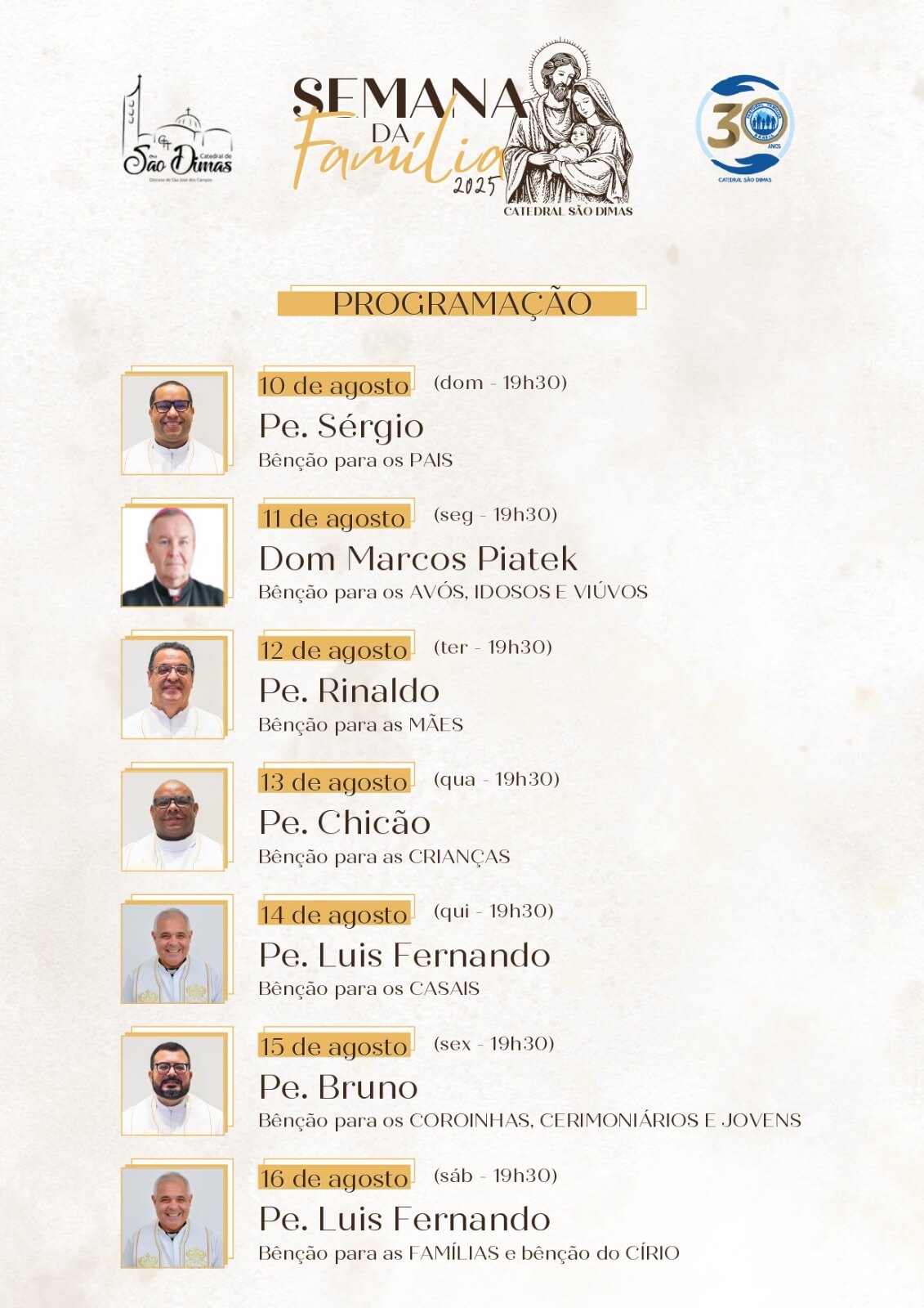 De 10 a 16 de agosto, às 19h30, na Catedral
